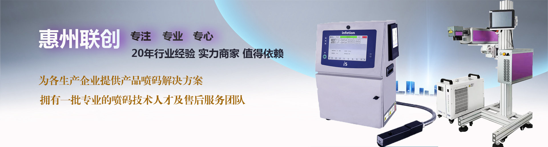 惠州聯創包裝設備有限公司是一家專業從事噴碼機及相關設備的企業。成立于2004年,總部位于廣東省惠州市。公司自成立以來一直致力于研發噴碼機及標識方案,現擁有自主品牌英訊噴碼機,同時代理國外品牌LINX噴碼機、依瑪士噴碼機、EBS手持噴碼機。
